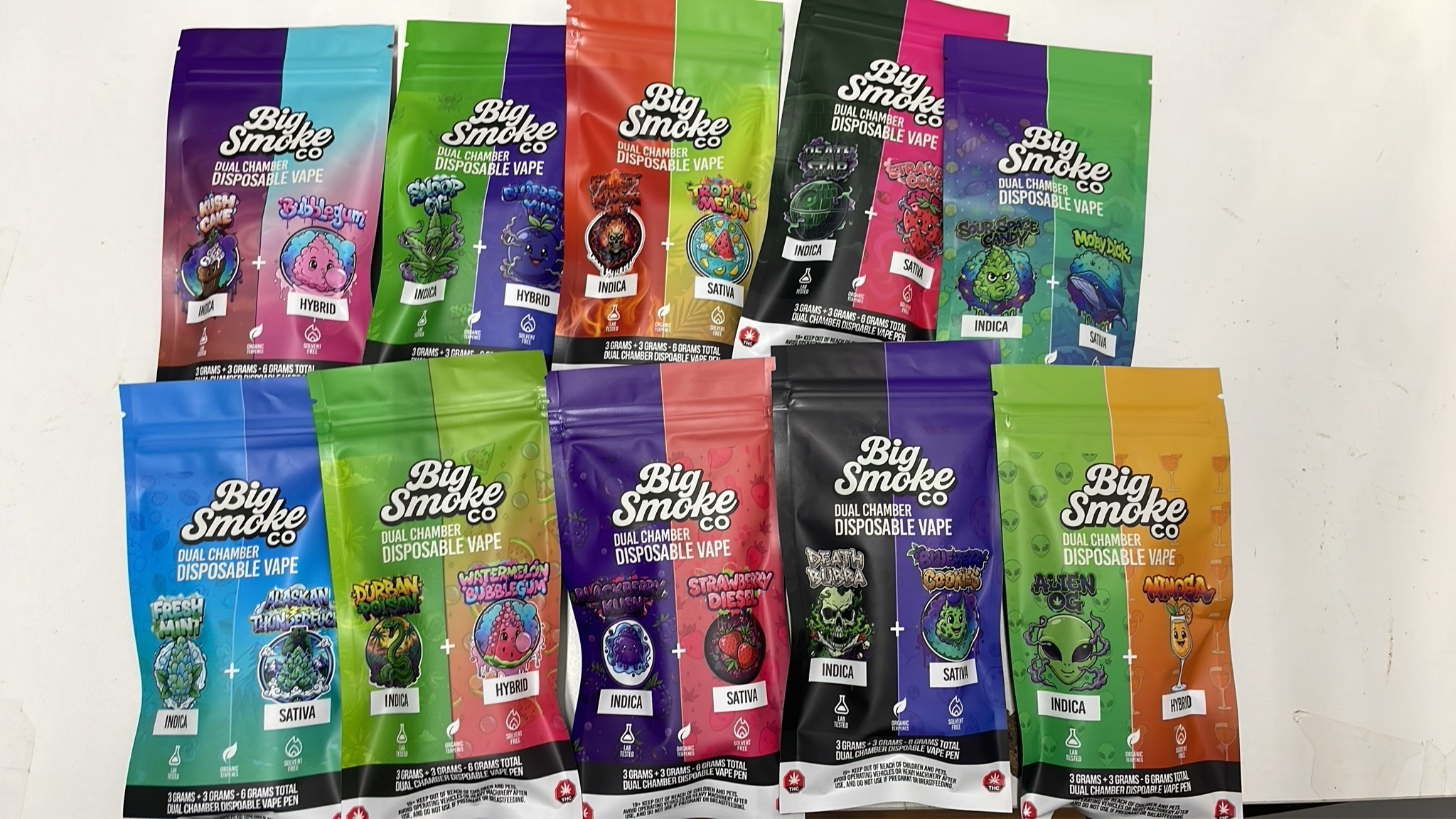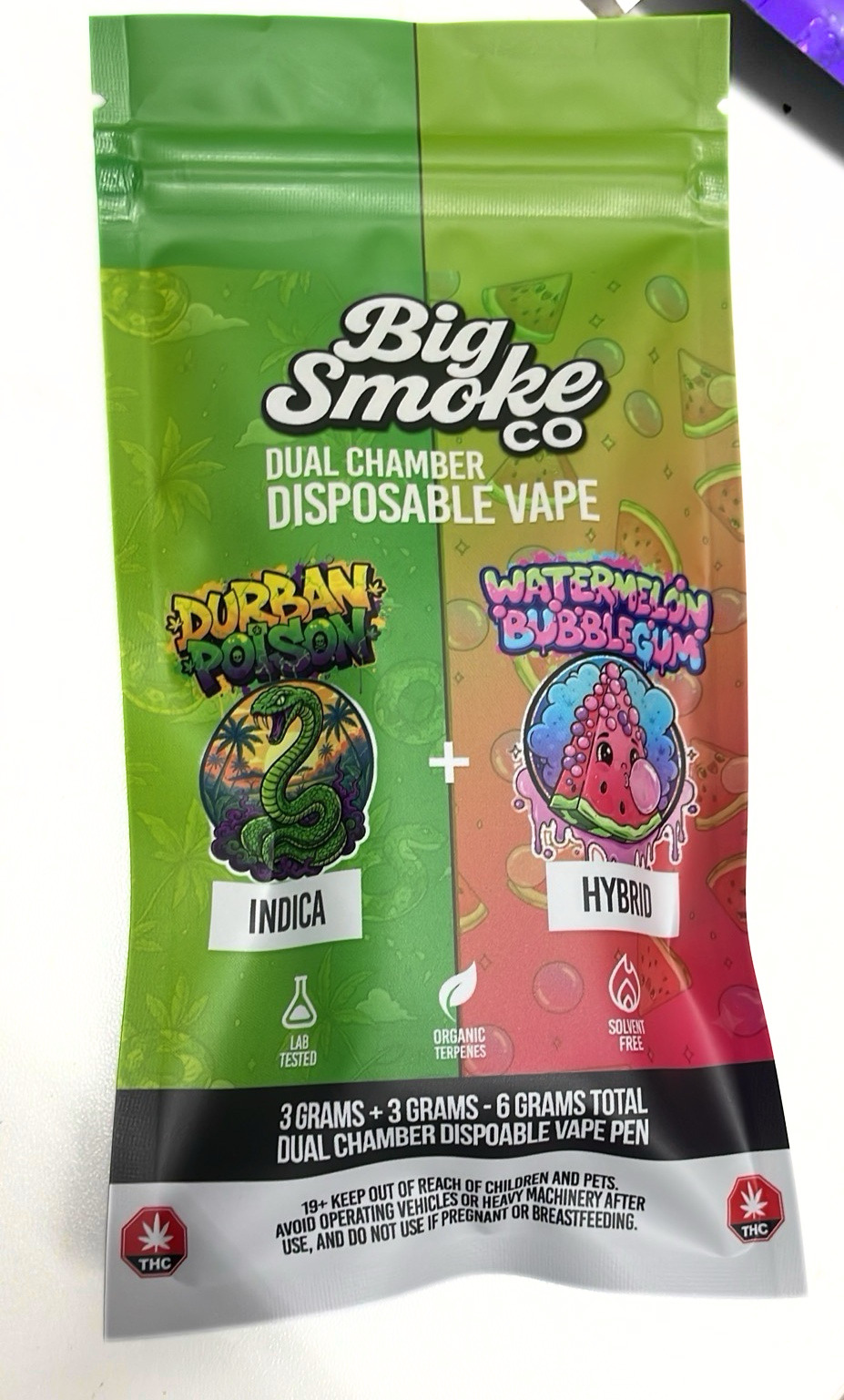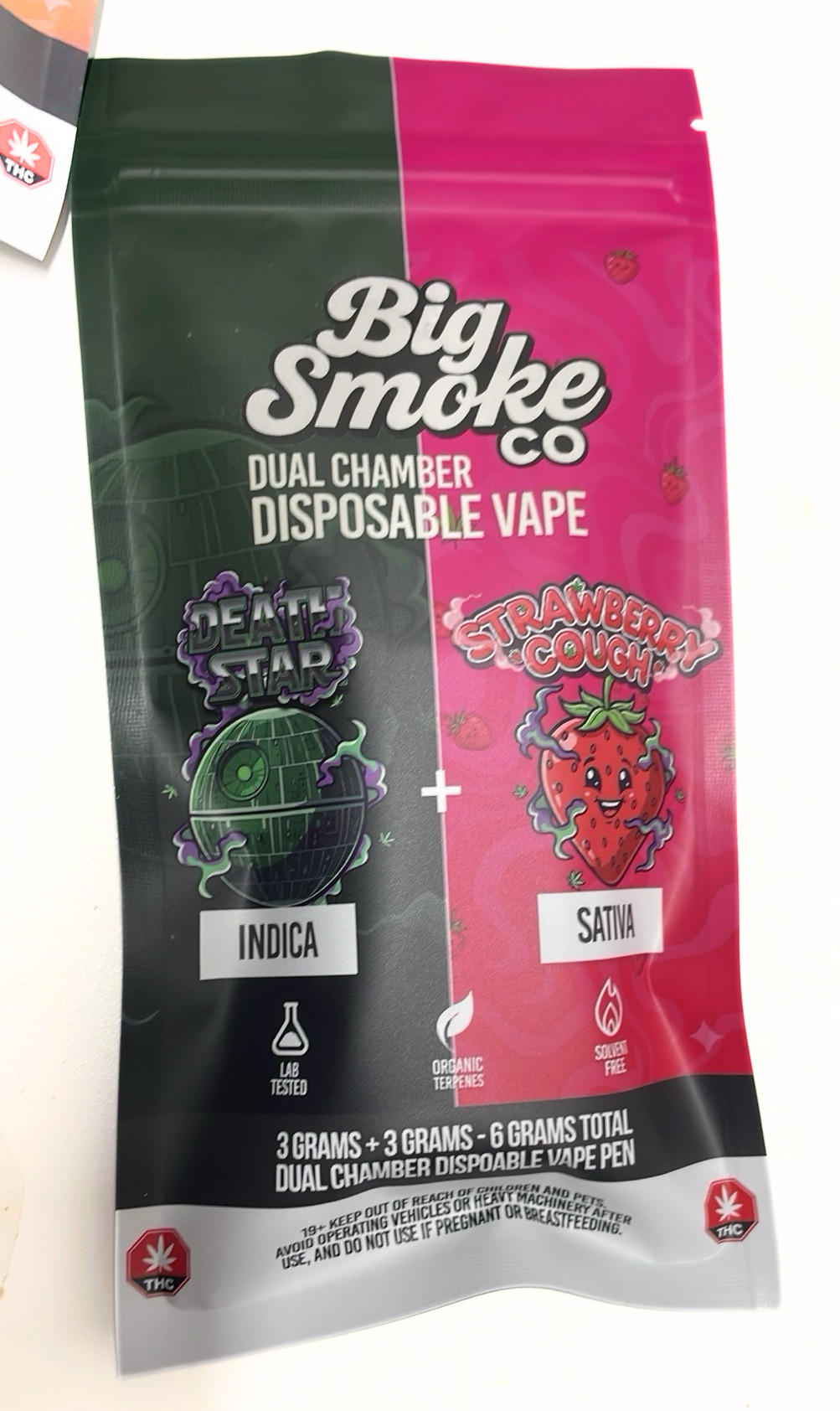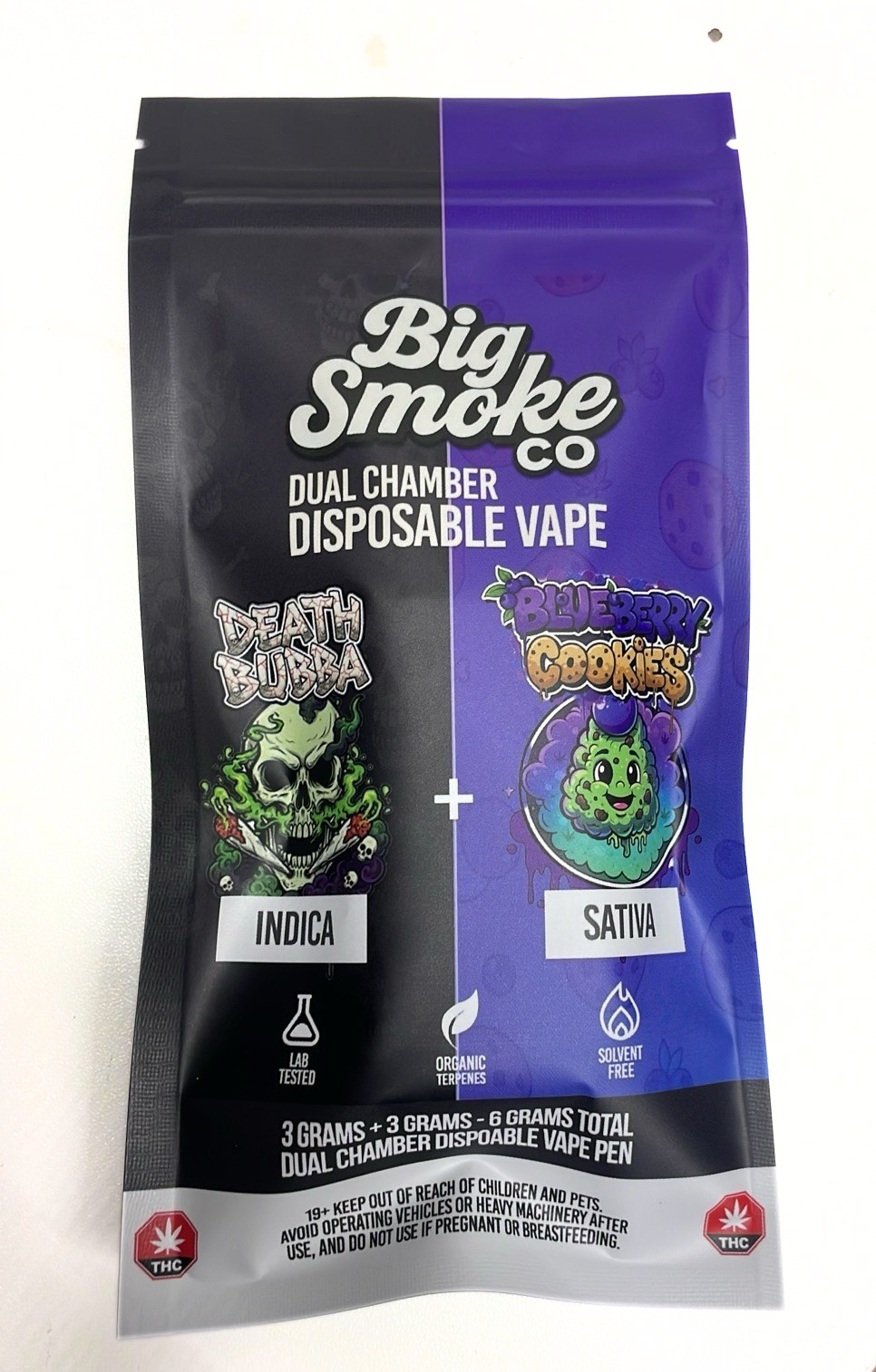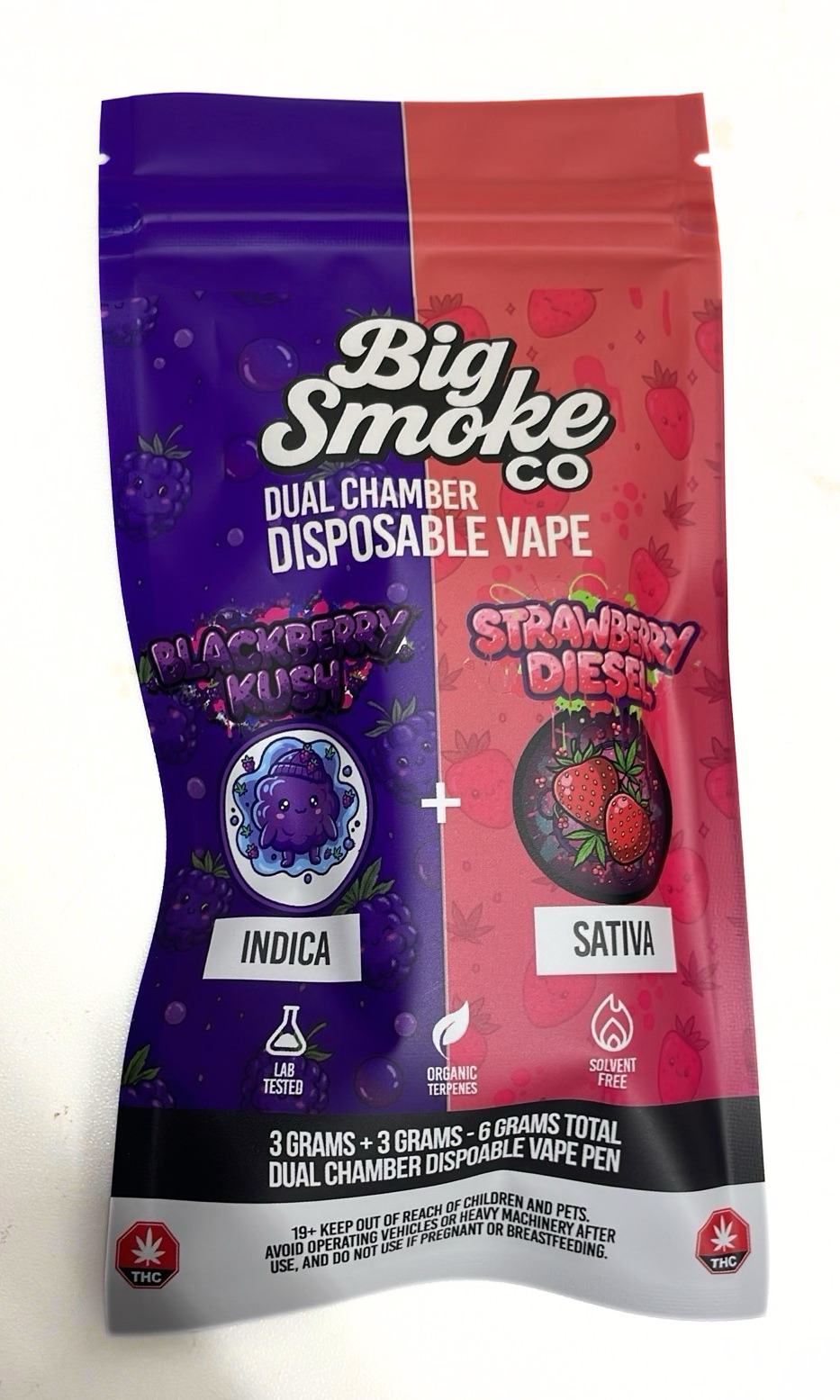 Big Smoke THC Dual Chamber Disposable Vape is a high-capacity, innovative vape device designed to deliver two strains in one unit, each chamber containing 3 grams of THC distillate for a total of 6 grams. This dual setup allows users to switch between flavors and effects, offering a versatile and customizable vaping experience.