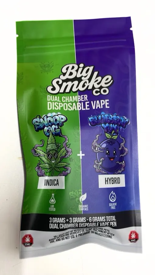 Big Smoke THC Dual Chamber Disposable Vape (6G) is a premium, high-capacity vape that delivers variety, potency, and convenience in one device. Perfect for those who want to enjoy multiple strain effects without switching products, offering both relaxation and energy whenever needed.