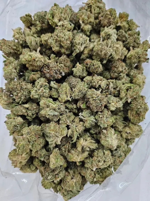 - Color:Â The buds display a deep green color, often accented with dark purple hues and a generous coating of frosty trichomes, giving them a glistening appearance.