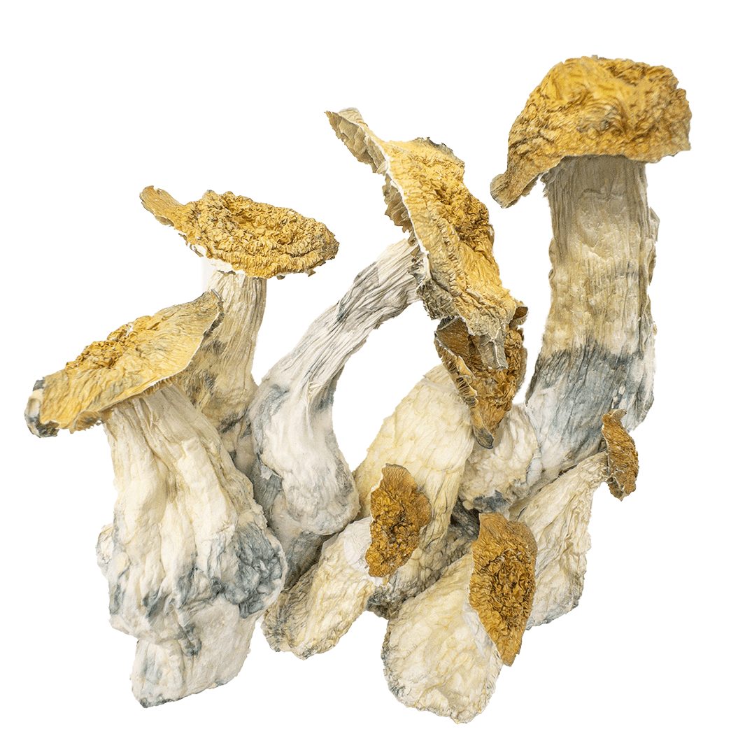 Makilla Gorilla mushrooms typically feature thick, chunky stems and medium to large caps with pale to light caramel tones. They often display bluish bruising when handled, indicating strong psilocybin content. Their dense, almost “meaty” structure is a hallmark of their premium quality.
