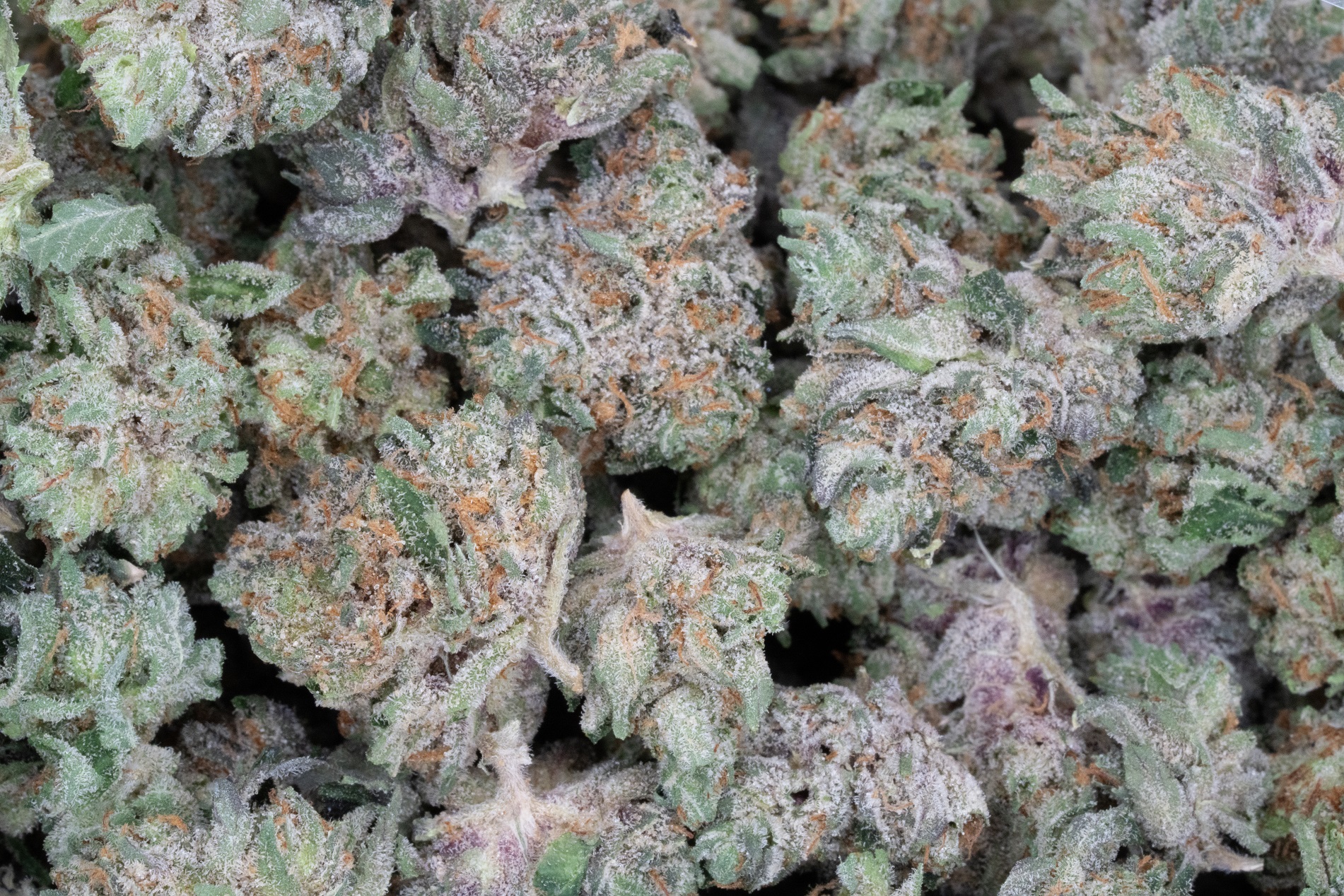 Trichomes: Coated in a thick layer of frosty crystals, reflecting its high THC content and craft-level quality.