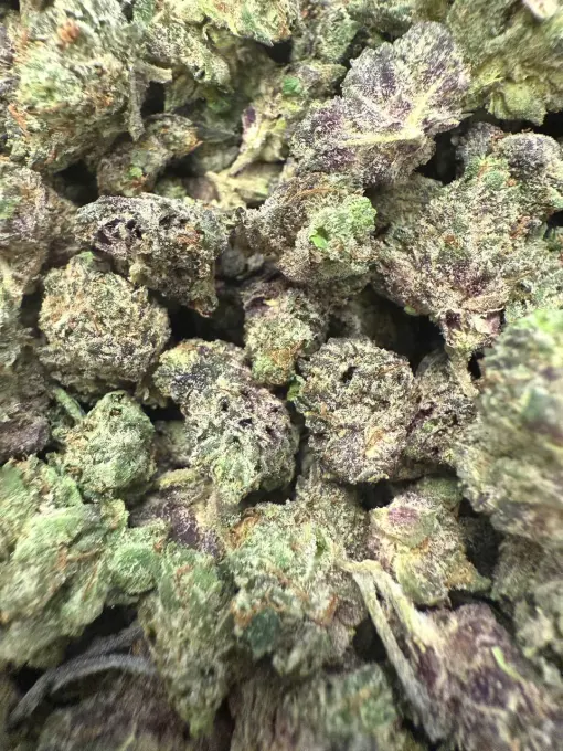 - Color:Â The buds typically display a vibrant green color, often highlighted by striking purple hues and a generous coating of frosty white trichomes, giving them an appealing and eye-catching appearance.