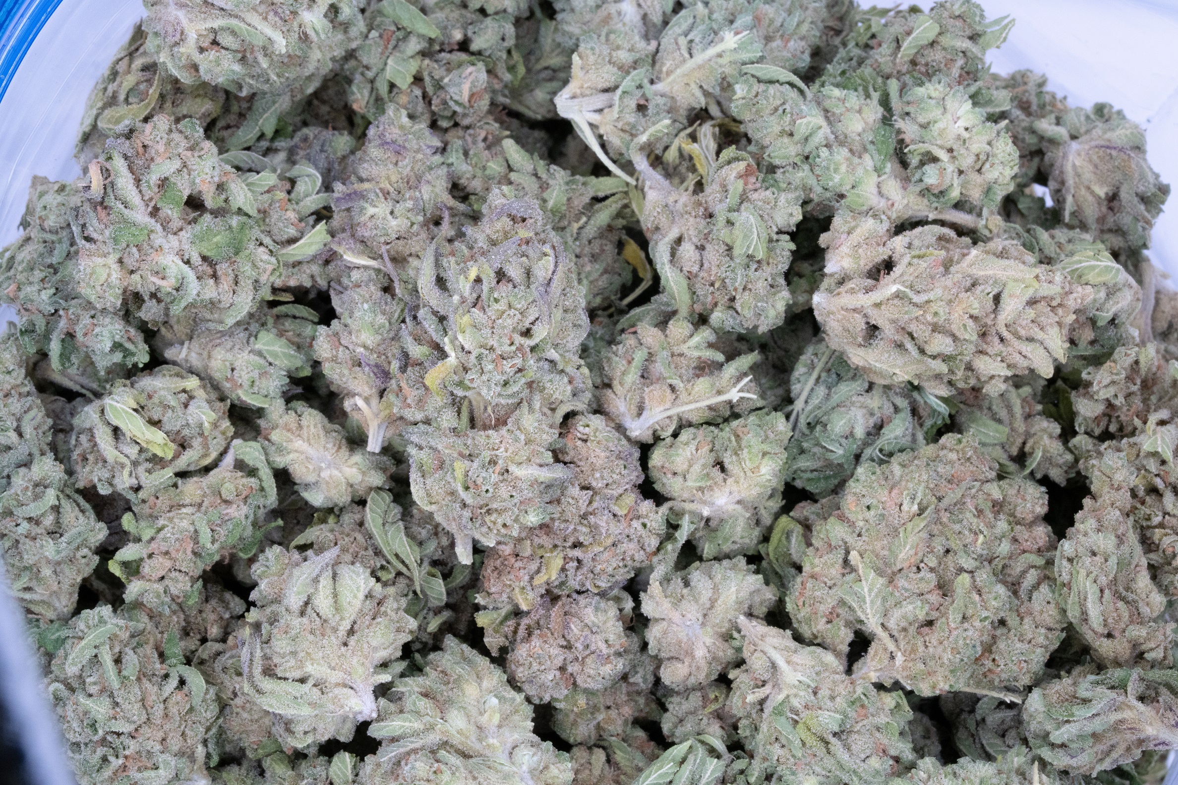 Trichomes: Coated in a frosty layer of sticky crystals, giving it a potent look.