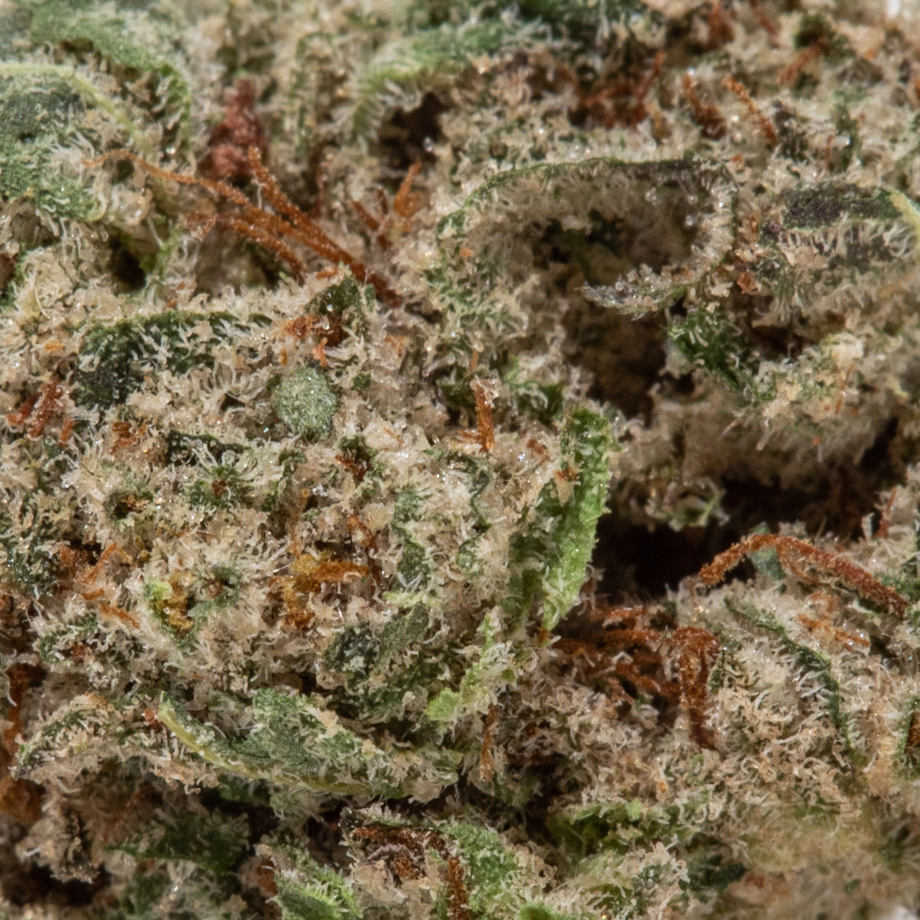 Trichomes: Heavy coating of frosty trichomes, giving the buds a sticky and sparkling look.