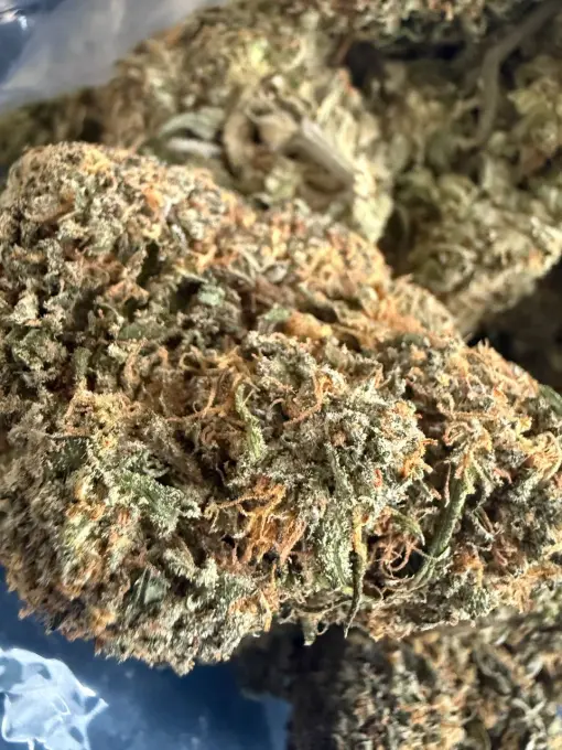 - Color:Â The buds typically display a vibrant green color, often accented with purple hues, bright orange pistils, and a generous coating of glistening trichomes, giving them a frosty appearance.